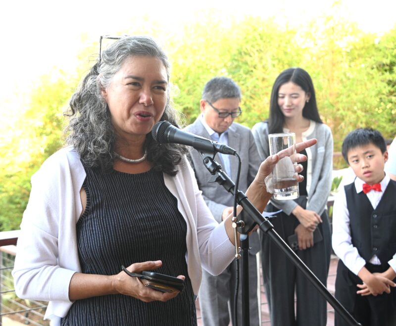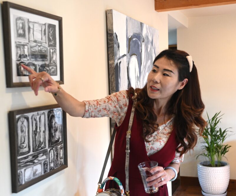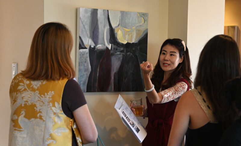 城市新闻10月25日洛杉矶报导,在陈校长升学规划机构校长陈德珂精心策划下,青年画家卡莱亚Calaya Amparo二十多幅系列艺术展「光之冥想」揭幕,以光为媒,用绘画传递希望,吸引众多民众前往参观。卡莱亚Calaya Amparo热情地为参观者导览每一幅作品,而著名时尚品牌设计总监Iwankee Chen 乐当画展中文导览,让艺术展生气昂然,热闹非凡。