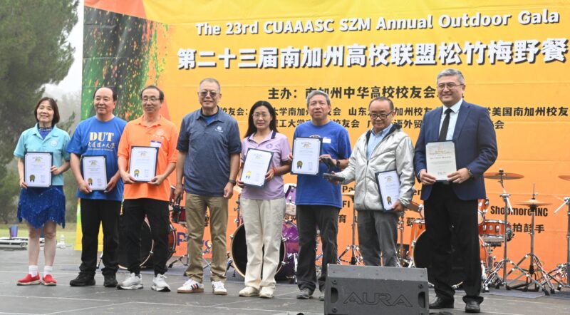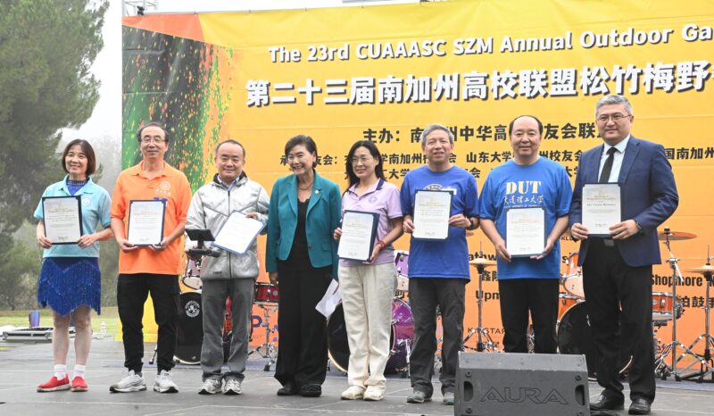 美国国会议员赵美心感谢联盟为社区带来的正能量,强调校友群体展现了华裔新生代的领导力与社会责任感。她还为松竹梅野餐会的主办方南加高校联盟和承办方的五家校友会颁发了贺状。