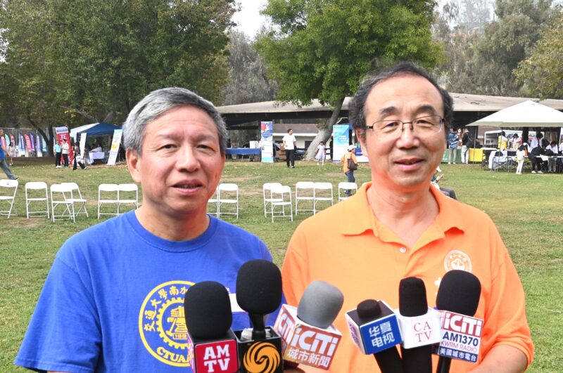 南加高校联盟会长代表万根荣(左)、许绍理(右)接受各大媒体记者访问