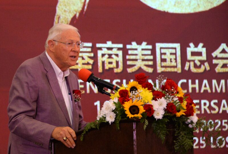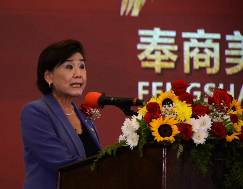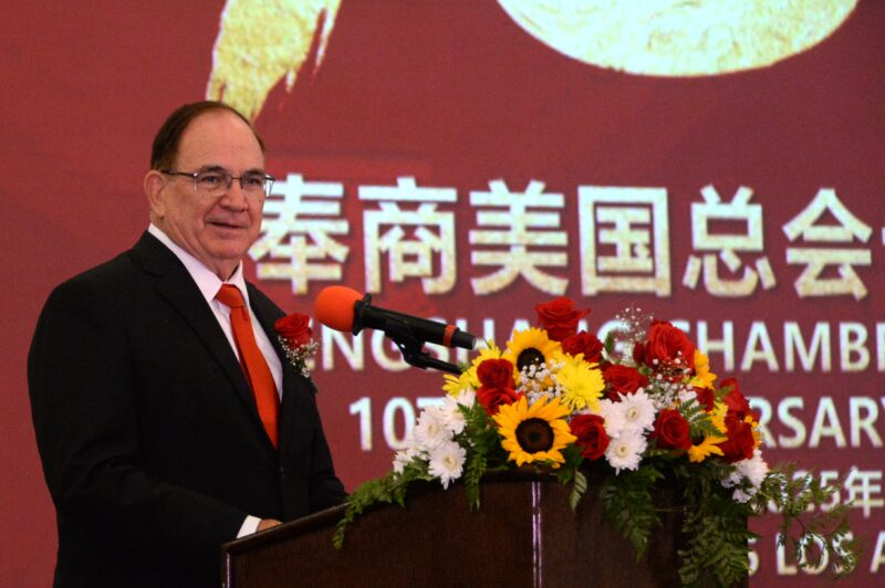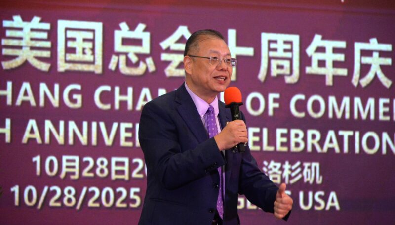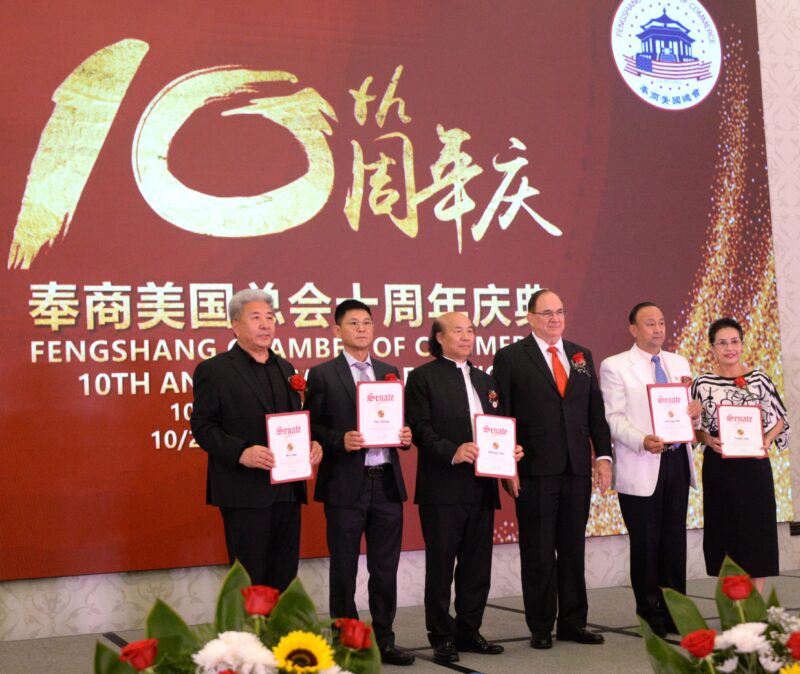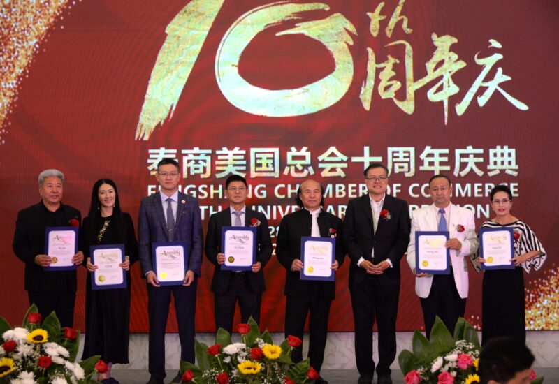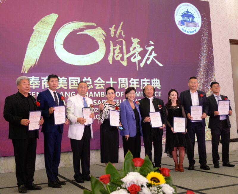 美国国会议员赵美心Judy Chu致辞,她深情回顾与奉商美国总会的深厚渊源,坦言曾出席商会第一届就职典礼,亲眼见证其十年间不断发展壮大、成为中美经贸文化交流桥梁的全过程。她高度肯定商会的重要贡献,并为朱俊英、翟维远(William)、孙英丽、张军、孙伟等十位商会领导颁发贺。