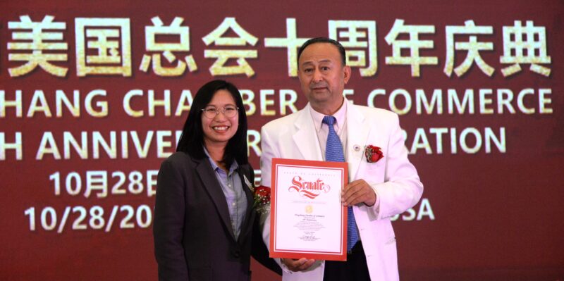 加州参议员Sasha Renee Perez代表彭依林向奉商美国总会主席朱俊英(右)颁发贺状