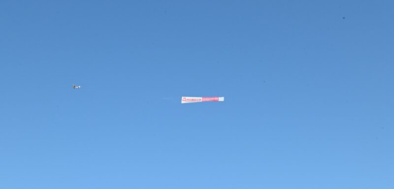 两架小飞机后面拖着「Home Co」广告横幅,在上空盘旋