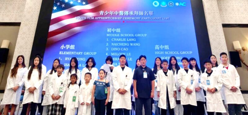“青少年中医拜师传承仪式”,由OAC 文化艺术委员会主席 Sofei Tong带领大家宣读誓词,多位美国针灸师与中医专家亲临见证,为首批“青少年中医实验室主任”授牌。这一仪式象征着传统文化在新一代手中延续,也标志着青少年成为跨文化传承的桥梁。