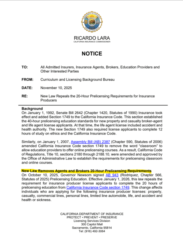 自 2026 年 1 月 1 日起,AB 943 在加州正式生效:报考保险执照的前置门槛大幅降低——从原本必须完成 20 小时的分线课程,缩减为仅需 12 小时的伦理与加州保险法修读(其中至少 1 小时关于保险欺诈)+通过州政府笔试即可。