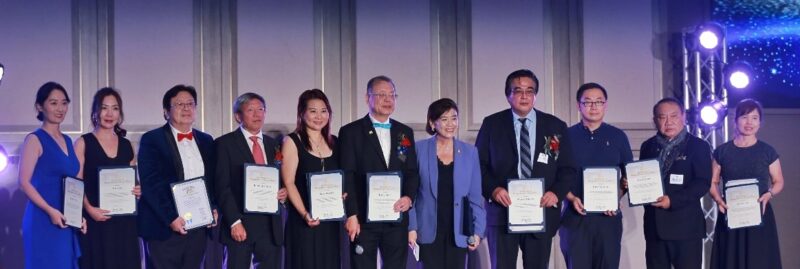 左起:陈宏正前会长、万荣根理事长、何桂平会长、阳明交大张懋中前校长、丁言愉前会长、谢东总会会长、张鸣前会长