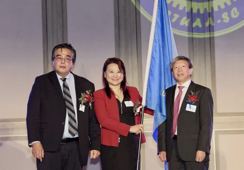接任会长何桂萍接会旗后发表了热情洋溢的演说。她以“荣幸与责任”开篇,简述了“五交同心”的主题深意,许下“强凝聚、促整合、稳财务、扩影响”的承诺,愿校友会成为校友的精神家园与事业助力。