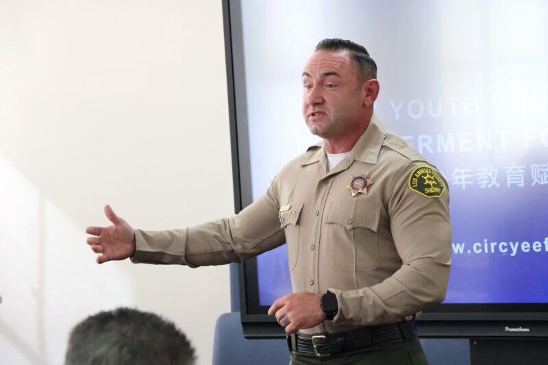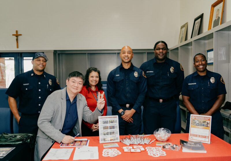 警局与消防局在会场设有互动式资讯站(booths)。学生们可以在 booth 区触摸装备、了解训练流程,甚至体验部分应急工具。许多孩子在与警官和消防员交流后,对公共安全职业产生了浓厚兴趣。当场有多名学生填写了兴趣登记表,希望加入青少年活动项目、消防预备计划或参与未来实习机会。老师们表示,这种学习方式让学生切身体验,走出课堂。除县级公共安全部门外,基金会也邀请康普顿学区警长吴韦霖( William Wu)代表学校安全体系分享他的观察与经验。他谈到校园安全、青少年成长与责任感的重要性,并鼓励学生勇敢尝试、愿意承担、积极探索。