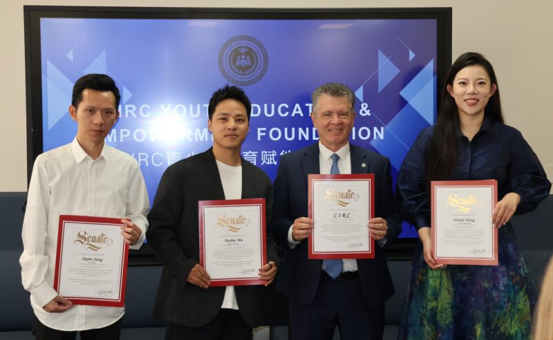 加州参议员 Bob Archuleta 代表 Kyle Miller向(左起):Kent Jiang(CIRC 副会长)、联合创始人 Vince Wu(CIRC 会长)、王温蒂( Wendy Wang)颁发表扬状