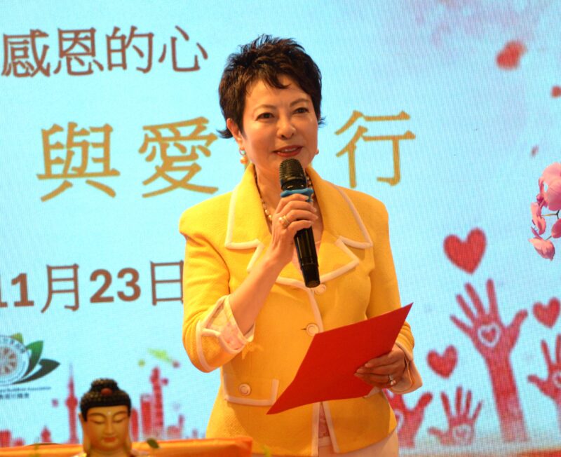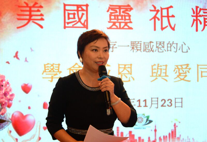 美国灵祇精舍会长杨弼(Brenda)发言:尊敬的上觉下林大和尚、元明法师、李青华付会长和各位侨领,以及各位师兄、阿弥陀佛。今天佛光普照,在这殊胜的日子,在感恩节来临之际,我带着无比感恩之心,首先感恩社团和侨领的支持;更感恩恩师觉林法师在过去13年的正知正见引领大众、弟子;感恩恩师漂洋过海,不辞辛劳的来到洛杉矶弘扬中华传统佛教文化。每次恩师一回到美国灵祇精舍就亲自主法供灯、放生、讲经说法;为信众祈福、排解情绪压力。即使远在中国也每日在线上慈悲开示,让信众弟子得以修正和提升自己。