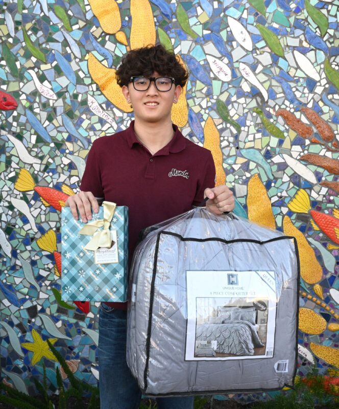 张娴会长带领十多位姐妹们捐赠物资送爱心、高中生 Gavin Wang(左)