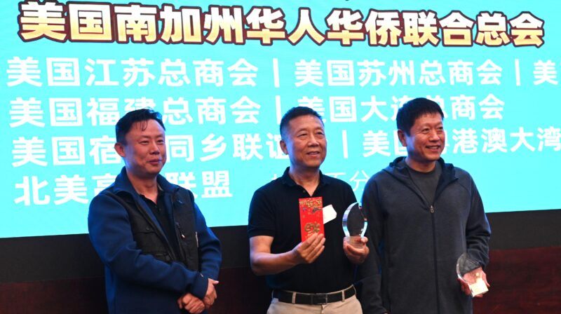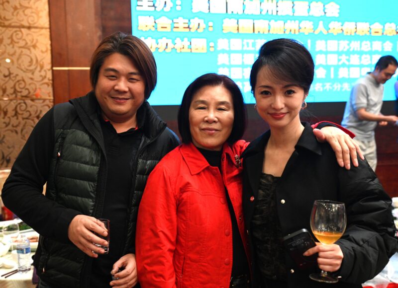 南加州掼蛋总会会长郭兰(中)、前央视电影频道主持人李蜜(右)等