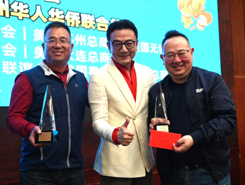 美国南加州掼蛋总会副主席徐晓峰(中)向亚军:邱堂善(左)、李胜(右)颁发奖杯和奖金
