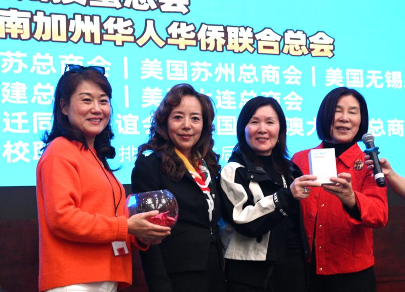 右起:南加州掼蛋总会会长郭兰、副会长、美国福建商會會長杨丽桢、Ling Sieu等