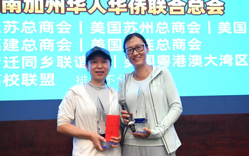 美国南加州掼蛋总会会长郭兰、荣誉主席蔡成华等为冠军颁发奖杯和奖金