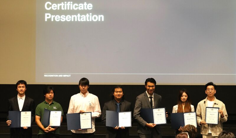 左起:Siche song、Size Dong、Yangming Zhang、姬海云(Haiyun Ji)、史迪夫(Difu Shi)、Ziyang Wang、 胡超(Charles Hu)获颁蒙特利公园市市长杨安立(Elizabeth Yang)荣誉証书