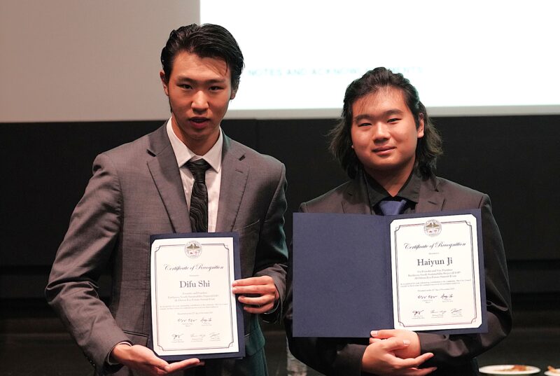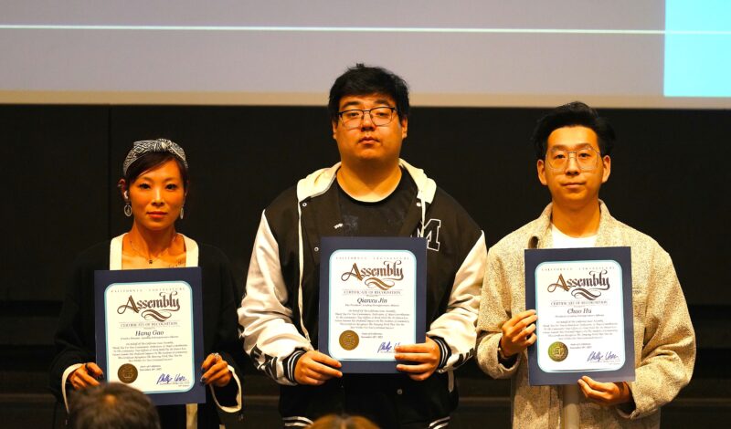 左起:杲航(Hang Gao)、金千旭(Qianxu Jin)、胡超(Charles Hu)获颁加州众议员陈立德(Phillip Chen)荣誉証书
