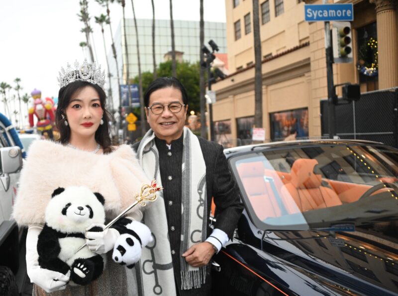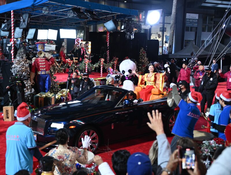 锣鼓助阵的美华联横幅队,象征团结、文化传承与社区力量,代表南加州华人与各族裔携手共融的精神,象征着热闹欢腾的节日景象。林日升驾驶礼宾车,陈慧碧总策划在敞篷车上频频向民众珲挥手致意,并向沿途民众抛送小熊猫。礼宾车两侧由表演者装扮成憨态可掬的大熊猫,为全场带来节日的笑容与趣味。