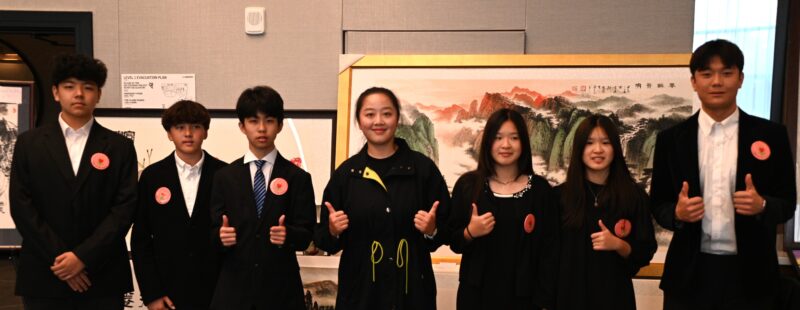 青少年导师Sandy(左2)与学生们、赫景秀会长(左3)、理事中山葵(右3)