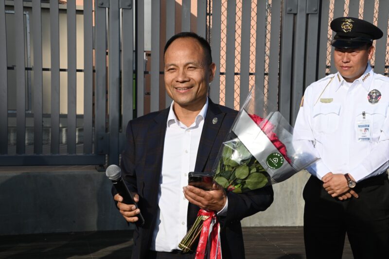 美国浙江电商物流商会会长孙浩诚(Mike Sun)作圣诞年会致词、洛城警卫安保总裁Jack(右)