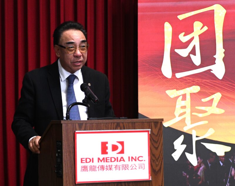 媒体主办、美国鹰龙传媒董事长、美国上海联谊会会长苏彦韬(左)、美中和平友好协会会长、上海滩餐饮集团总裁鹿强致词
