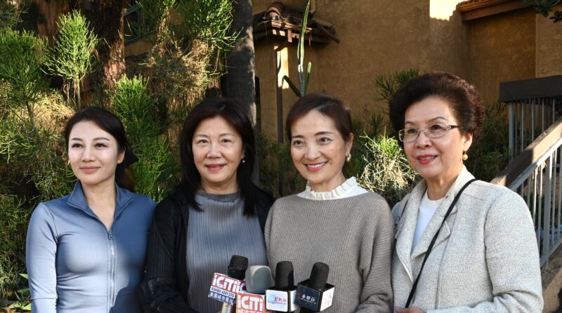 美国华人妇女联合会会长张娴(右2)理事长曹琳(右1)监事长郭志凌(左2)执行会长丁扬(左1)接受各大媒体记者访问