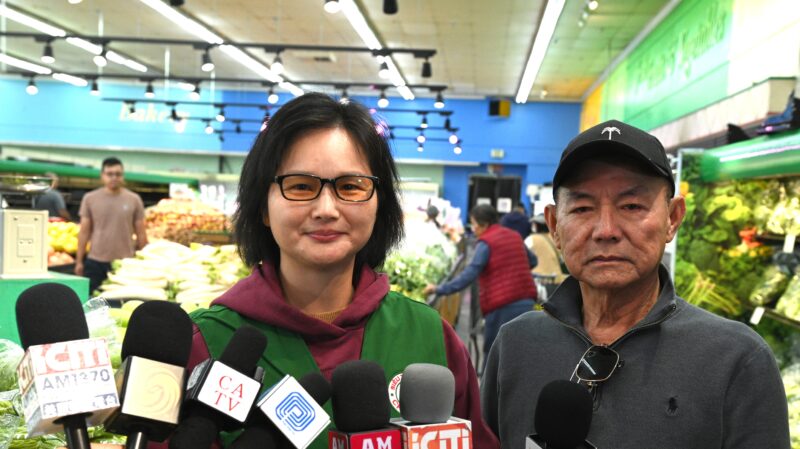 吉利超市老板杨文兴(右)、主管谢红(左)接受各大媒体记者访问