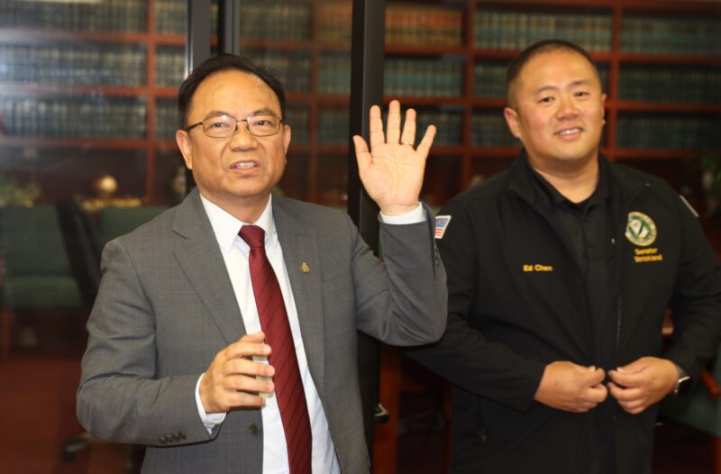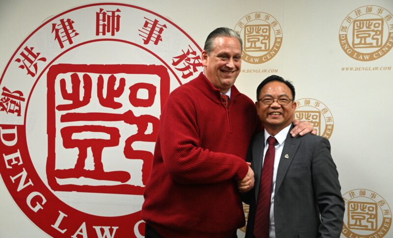 加州共和党参议员斯作兰德(TONY STRICKLAND)、邓洪律师(右)