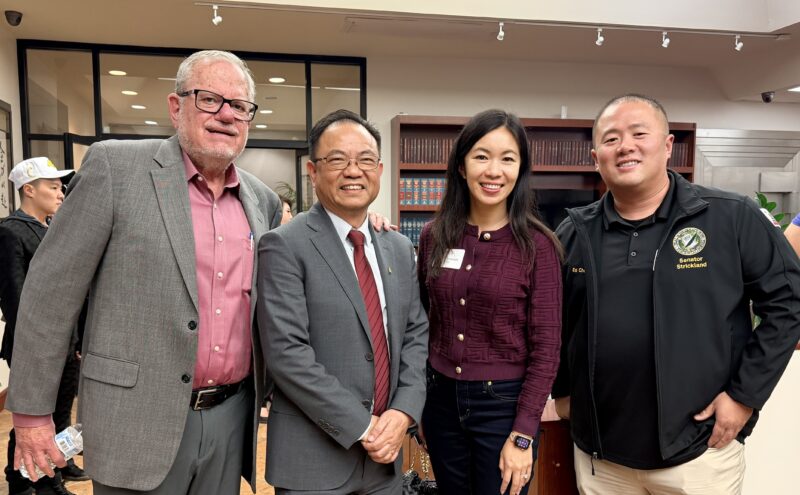 右起:加州共和党参议员斯作兰德(TONY STRICKLAND)、前加州共和党议长BOB HUFF 与夫人何美湄等