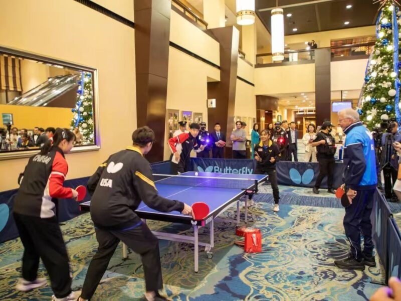 美国国家队前队员Dell Sweeris及Connie Sweeris夫妇与世界冠军(世青赛)李和宸和胡一以及美两国青年乒乓球运动员在现场进行友谊赛。