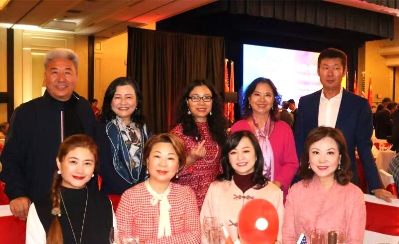 美国华人社团联合会主席张勇(左6)、荣誉主席鹿强(左7)、巾帼会会长方蕾(左5)、美国飞虎队传播协会虞清(左4)、北美高校联盟主席陈峥(右5)、美国洛杉矶福建联合总会副主席郭希凤(左2)、美华联曹大福(左8)、马雪川(左3)等