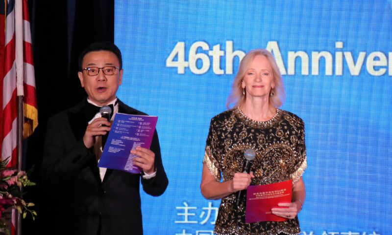 美国南加州华人华侨联合总会共同会长、美国江苏总商会会长徐晓峰(左),荷兰莉主持活动
