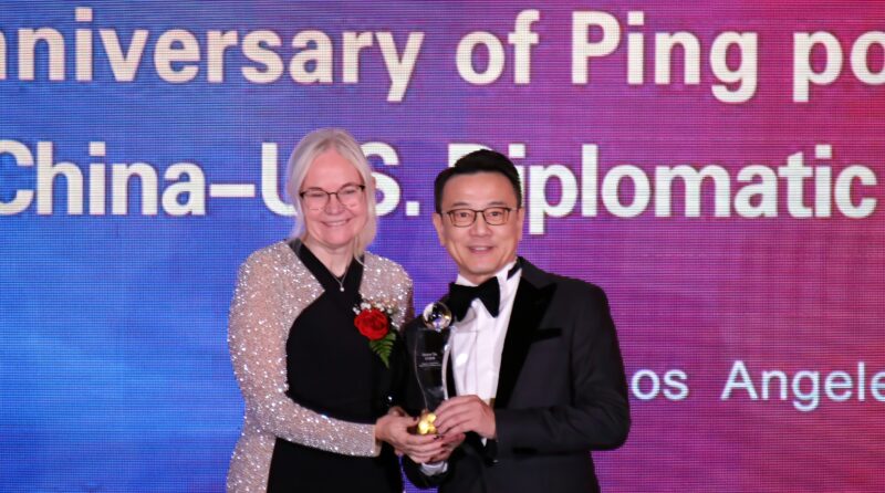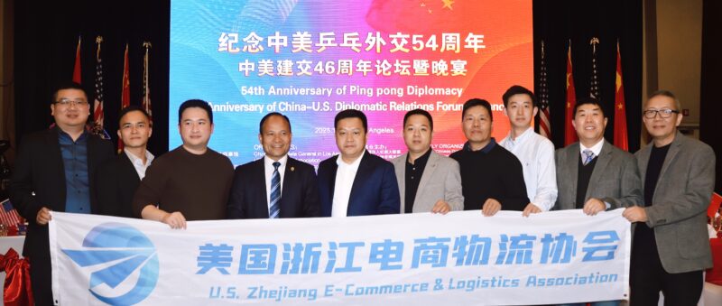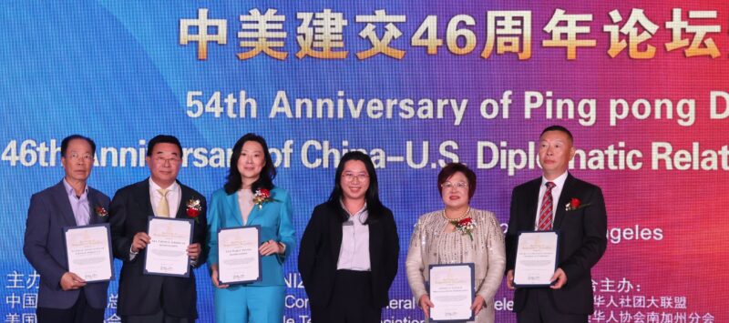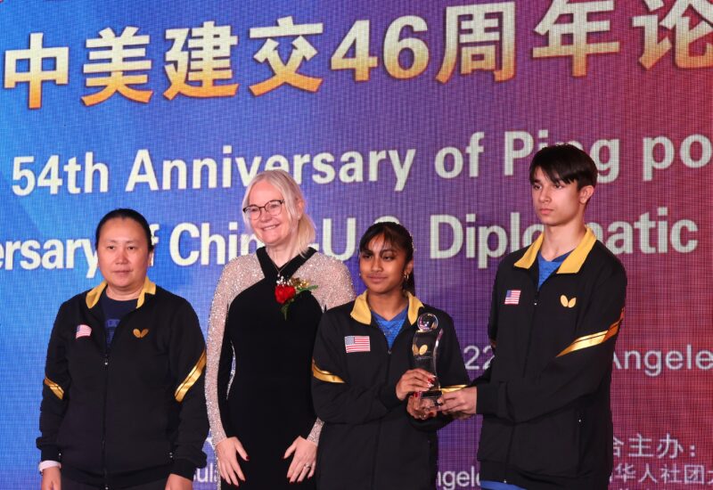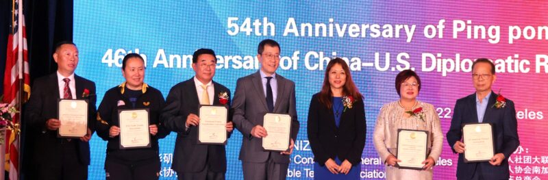 城市新闻12月22日工业市报道,纪念中美“乒乓外交”54周年暨中美建交46周年论坛暨庆祝晚宴在棕榈泉度假酒店隆重举行,中国驻洛杉矶总领事馆总领事郭少春大使偕夫人王薇、副总领事郭志强、原中国女排教练郎平、国际乒联副主席、美国乒协CEO、美国奥委会委员沈伟妮、中国乒协青年部部长王琛、世界冠军(世青赛)李和宸和胡一,国会议员赵美心助理李青蔚、加州众议员方树强、加州财务长马世云、加州参议员Maria Durazo、加州参议员Bob J. Archuleta代表Kyle Miller、圣盖博市市议员丁言愉、杜瓦堤市市议员康佳琛等政要与来自政界、商界及侨界约600人出席活动,共同回顾中美“乒乓外交”的历史进程,展望两国关系未来发展。美国南加州华人华侨联合总会共同会长、美国江苏总商会会长徐晓峰,荷兰莉主持活动。