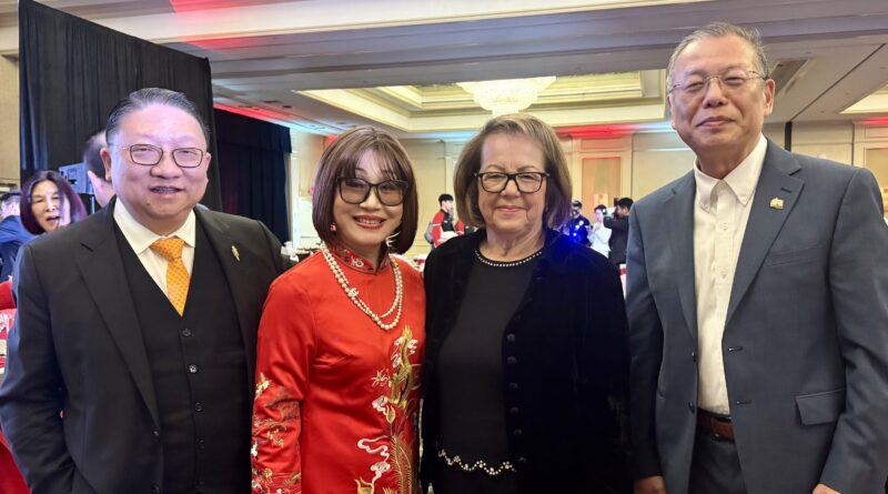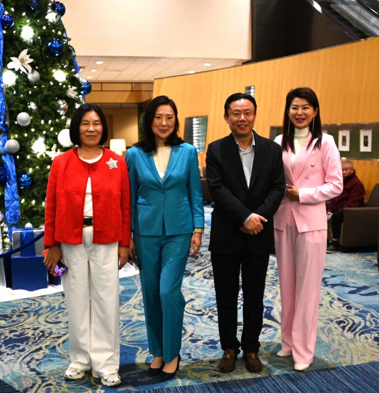 左起:美国鹰龙传媒董事长苏彦韬、核桃市前市长苏王秀兰、加州参议员Maria Durazo、圣盖博市市议员丁言愉
