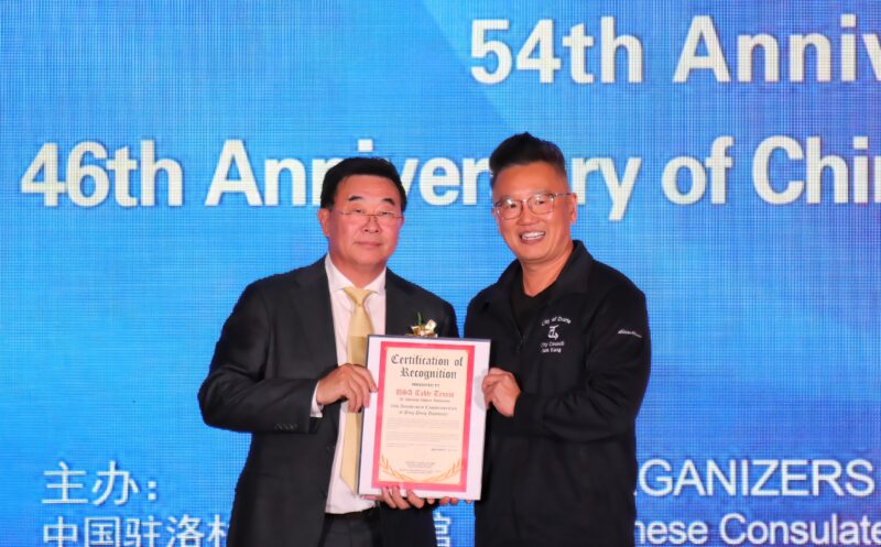 杜瓦迪市市议员康佳琛向美国南加州华人华侨联合总会会长蔡成华颁发贺状