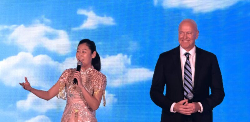 右起:美国鹰龙传媒董事长苏彦韬、中国女排前教练郎平