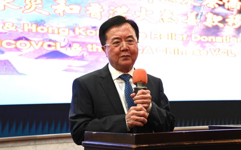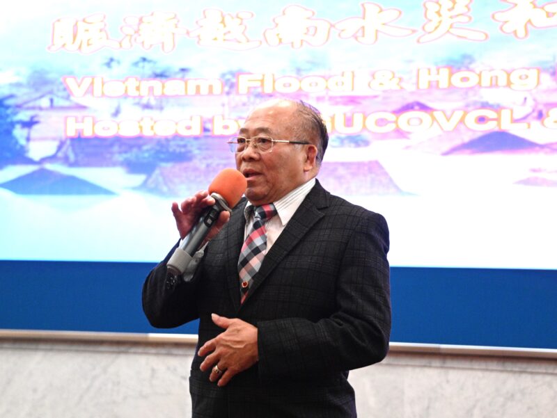 世界越柬寮华人团体联合会永远荣誉主席余建强则以中、越双语致词,他回顾世联会多年来在国际重大灾难中的慈善足迹。他细数历年赈灾成果,包括台湾九二一大地震捐款五十万美元;非洲海地大地震十万美元;纽约九一一事件六十万美元;南亚海啸四十万美元;美国卡翠娜飓风洪灾二十万美元;以及四川汶川大地震超过六十万美元等,累计募捐金额已超过三百万美元,充分展现侨团深耕公益、反馈世界的长期承诺。