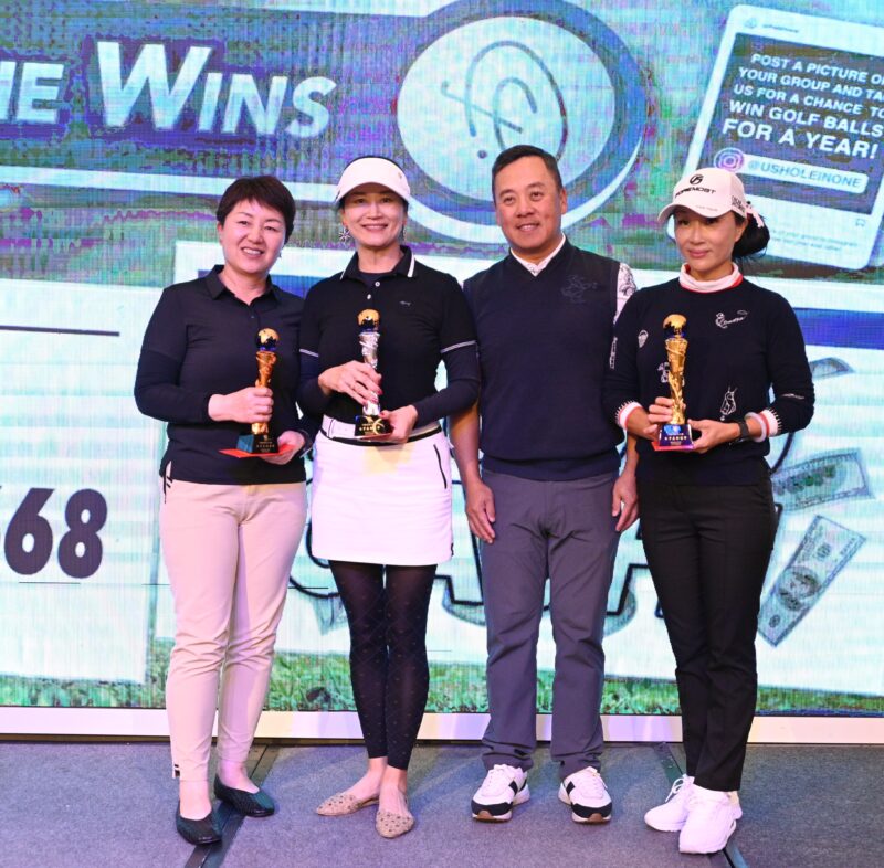 女子总杆冠军Lili(右1) 、女子总杆亚军 Sarah Yan(左2 ),女子总杆季军May Lu( 左1)、Aaron Yoo(右2)