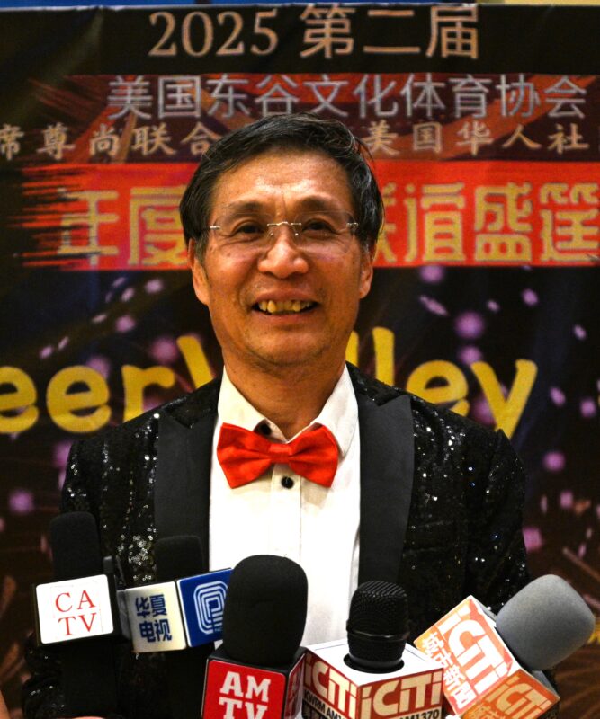 美国华人社团联合会理事长江风年接受各大媒体记者访问