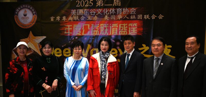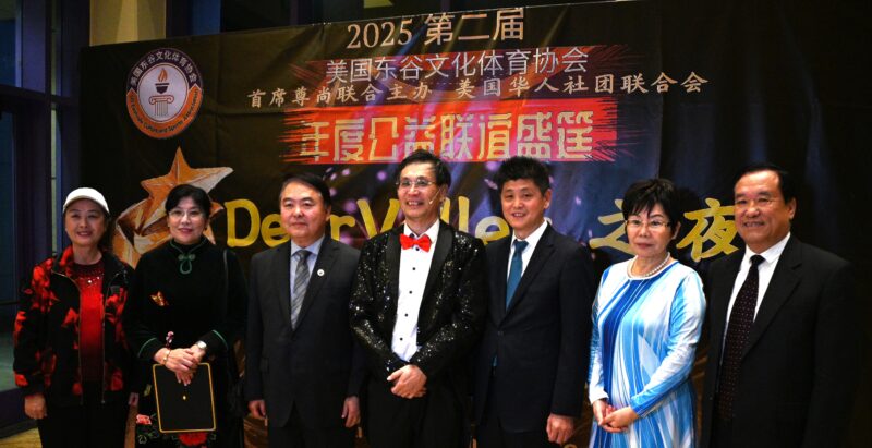 美国华人社团联合会理事长江风年、监事长赵林、共同主席团主席许承武、执行长林连连向东谷文体协会主席宋诚颁发祝贺状
