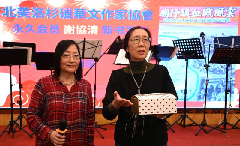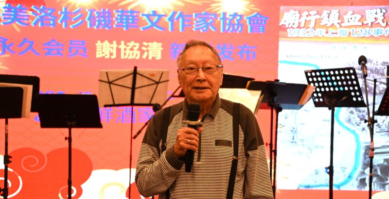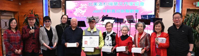 北美洛杉矶华文作家协会颁发荣誉证书,介绍新增顾问,并特别为年长老会员(含顾问)敬献蛋糕,感谢他们数十年如一日支持会务、兢兢业业勤于写作的精神。同时,协会亦表彰一年来为会务发展作出卓越贡献的会员,并举行永久会员谢协清的新书「庙行镇血战风云」发布。