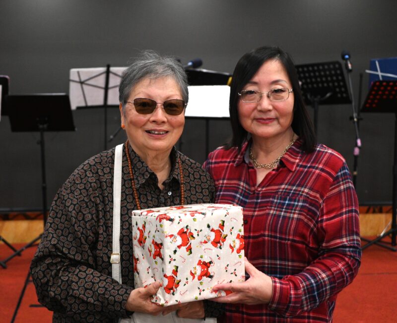 秘书长丹霞向资深作家杨强夫人(左)赠送节日礼物