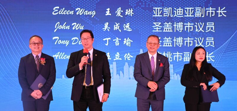 左起:核桃市副市长伍立伦、盖博市议员吴程远、丁言愉、阿凯迪亚市副市长王爱琳致词