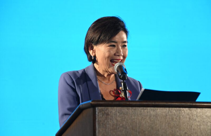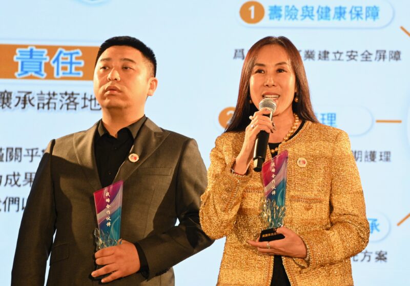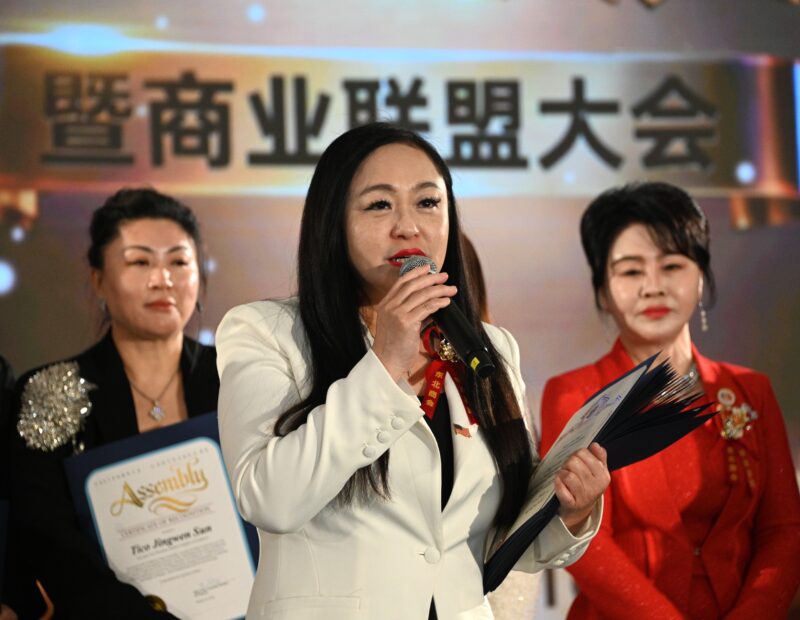 美国东北总商会监事长尹伶俐( Lesley Jen 右)发言