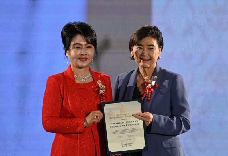 庆典活动举行美国东北总商会换届就职仪式,创会会长路霞担任商会主席、优秀青年企业家朱京一担任新一届会长。国会议员赵美心首先致辞,并向创会会长路霞颁发贺状,表彰美国东北总商会在促进社区经济发展、推动美中经贸发展及民间友好往来所做出的突出贡献,对路霞给予高度评价。她表示,美国及加州的经济发展,需要向美国东北总商会这样的社区组织搭建桥梁、发挥出重要作用。