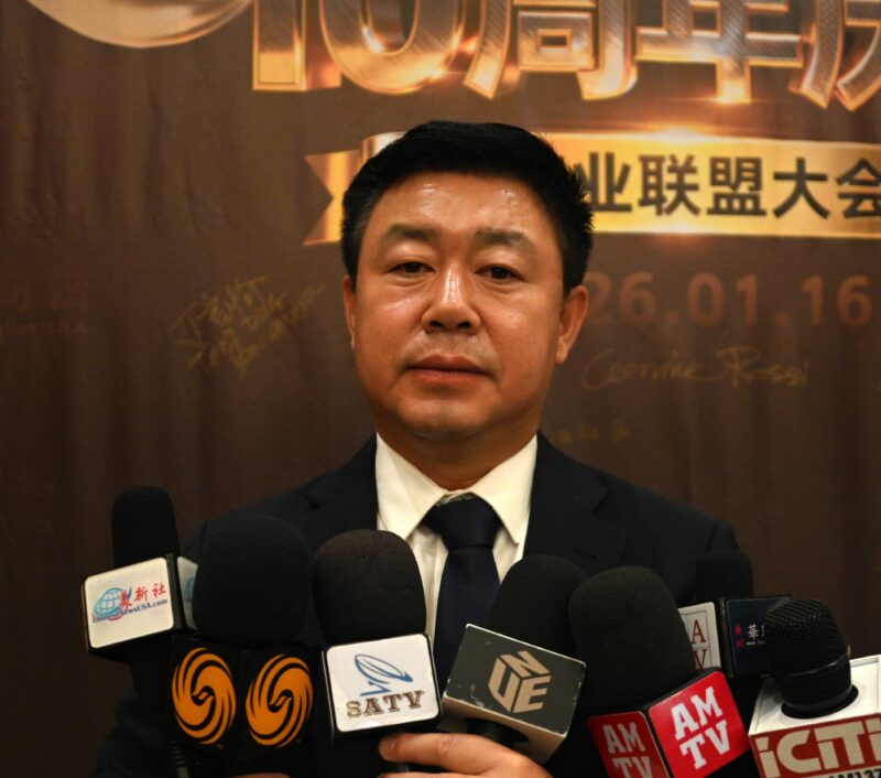 美国东北总商会新任会长朱京一接受各大媒体记者访问