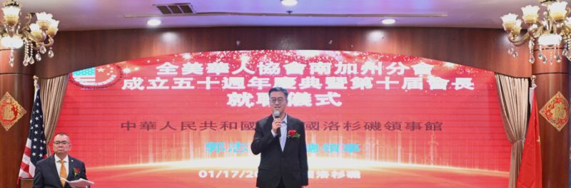 郭志强副总领事在致辞表示,50来全美华人协会南加州分会砥砺奋进,南加地区乃至全美都非常有影响力、非常重要的传统侨社的代表。华协50年的历史,与中美关系的发展史,以及与中国改革开放史,在时间段上高度重合,是非常不平凡的。50年来我们见证了许多、经历了许多、也收获了许多。特别是在上个世纪80年代,华协在洛杉矶华埠升起了第一面中国五星红旗,谱写了南加州华人华侨爱国爱乡的壮丽篇章。