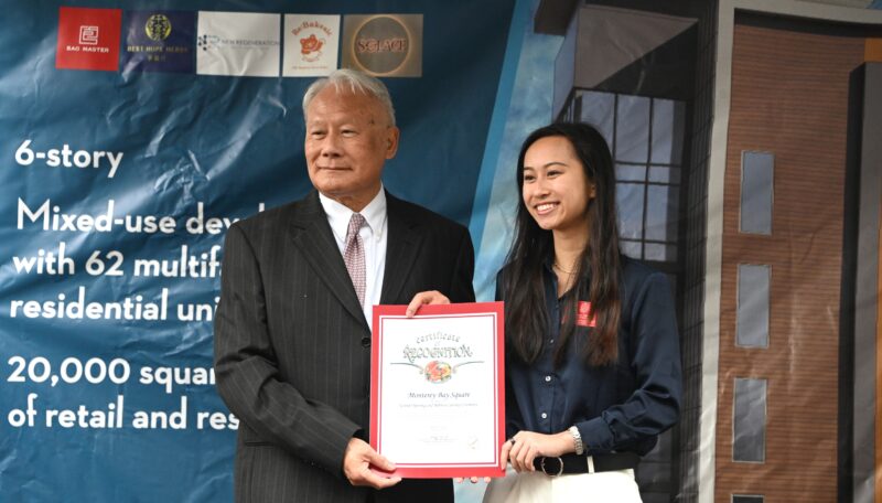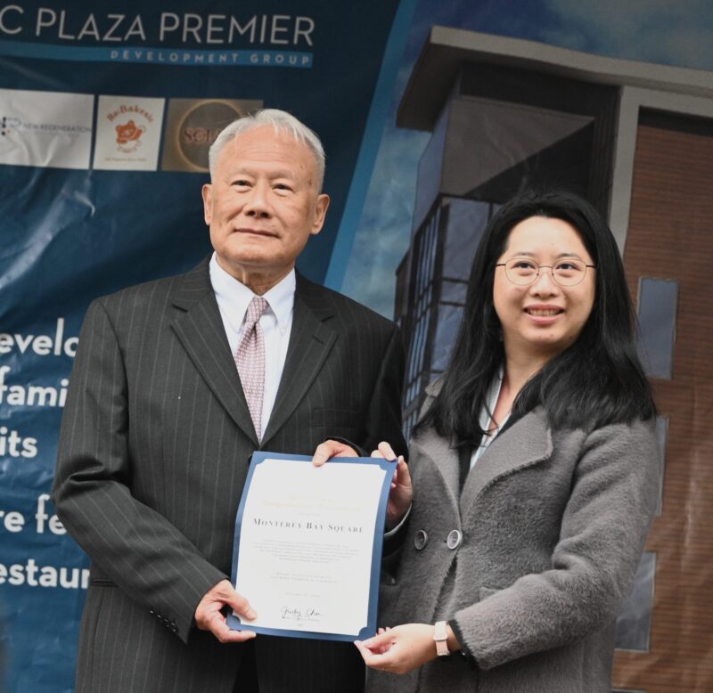 城市新闻1 月 22日阿罕布拉市报道, Alhambra 蛋黄核心地段的全新高端混合式住宅与商业项目 Monterey Bay Square正式剪彩启用,国会议员赵美心代表李青蔚Gigi、加州参议员Sasha Renee Perez代表Amber Giang、加州众议员方树强的代表贺文博Jayson出席致词并向美国太平洋房地产开发公司总裁周秦颁发贺状。