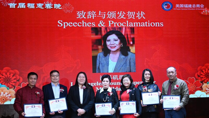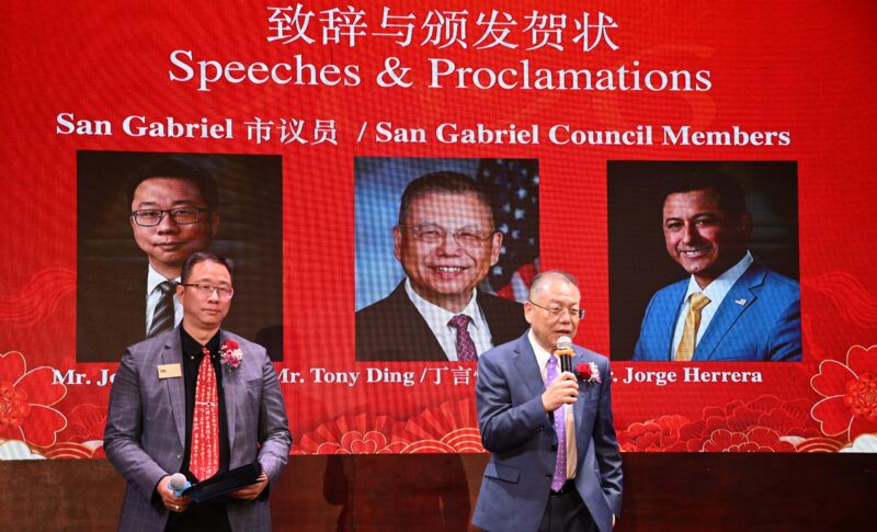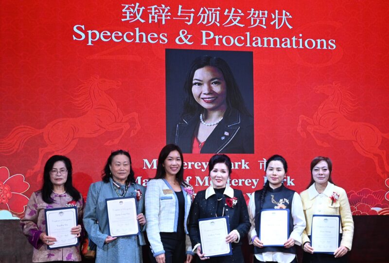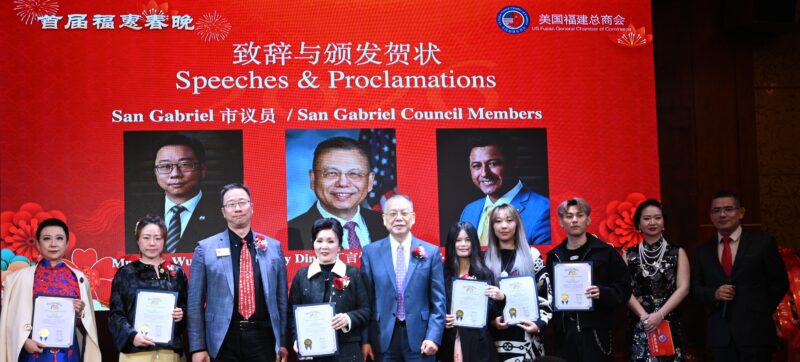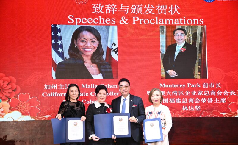 美国国会议员赵美心代表Maile Plan、加州众议员方树强、加州主计长Malia Cohen代表林达坚、洛杉矶县政委员Hilda Solis代表Joyce Li、洛县估值官Jeffrey Prang代表卢春雨、蒙特利公园市市长杨安立、核桃市副市长伍立伦、圣盖博市议员吴程远、丁言愉等出席祝贺,并颁发贺状。