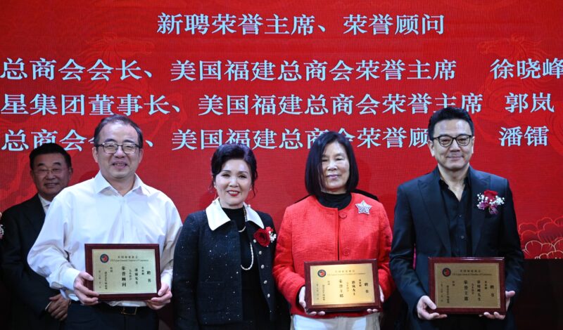 美国福建总商会会长杨丽桢向商会荣誉主席郭岚(右2)、徐晓峰(右1)和荣誉顾问潘镭(左1)颁发证书