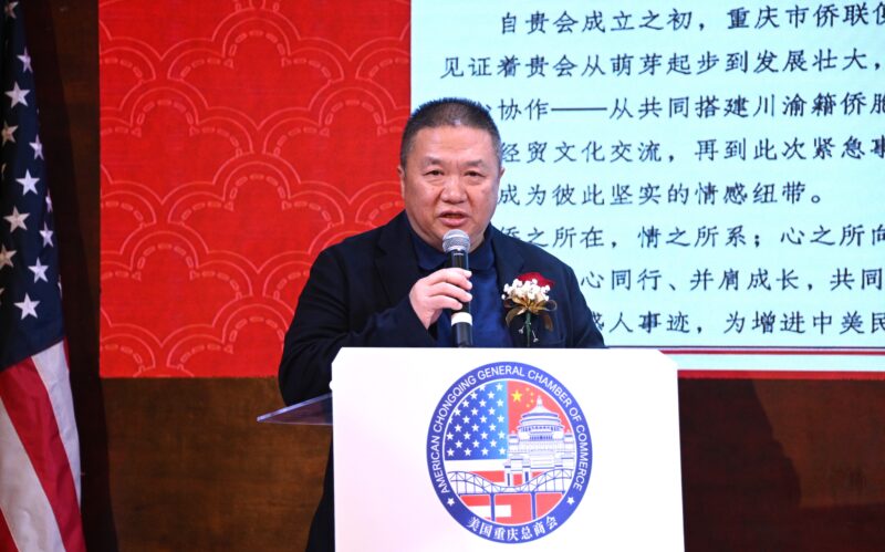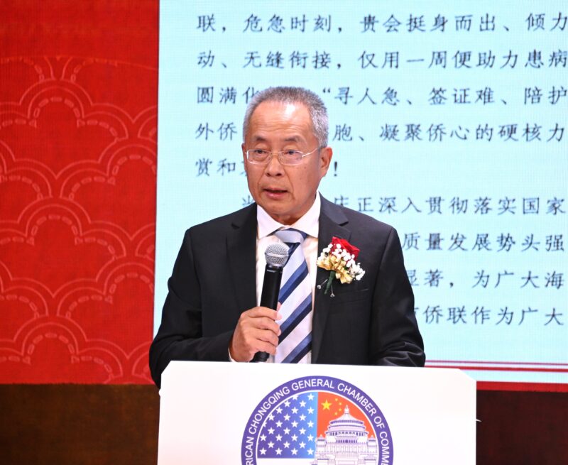 美国重庆总商会理事长熊宇镝宣读《重庆市归国华侨联合会贺信》